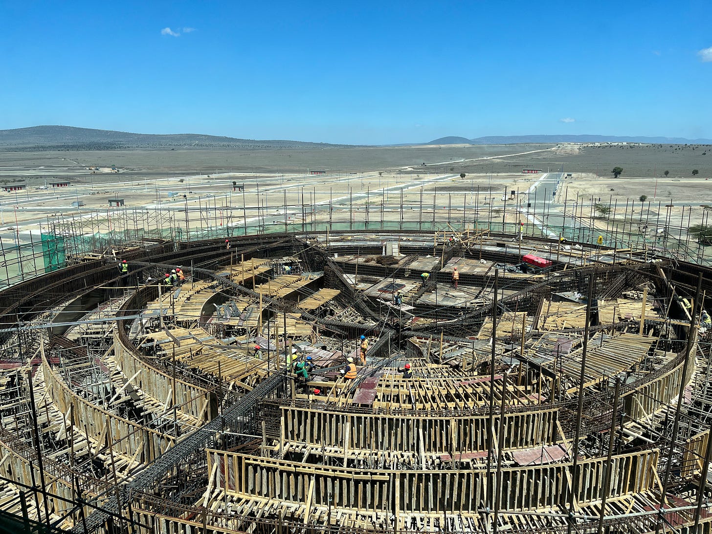 Image showing construction underway on the Konza Technopolis conference centre in 2023. The KTC has long been planned as a new city south of Nairobi, led by the Kenyan Government and envisaged as a techno-hub for the future economy. While there has been little on the ground construction, leading to suggestions the project has become a ‘white elephant’ the Kenyan state continues to invest in the infrastructure of this new city and progress, however slow continues (Image J Silver).